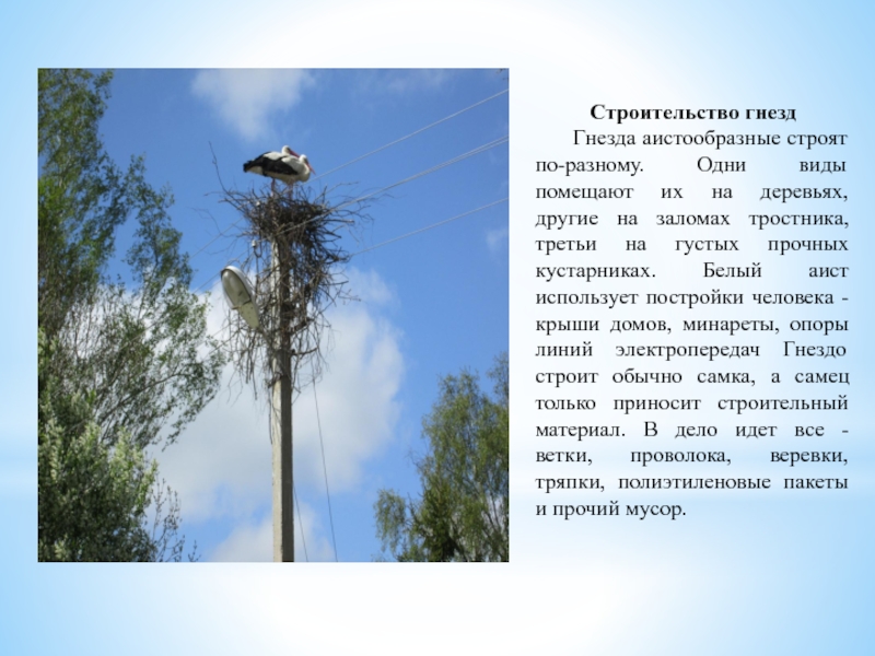 строят по-разному. Одни виды помещают их на деревьях, другие на заломах тростника, третьи на густых прочных кустарниках. Белый аист использует постройки человека - крыши домов, минареты, опоры линий электропередач Гнездо строит обычно самка, а самец только приносит строительный материал. В дело идет все - ветки, проволока, веревки, тряпки, полиэтиленовые пакеты и прочий мусор.