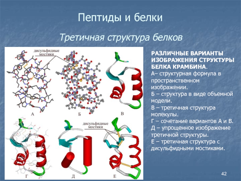 Пептиды и белки   Третичная структура белков РАЗЛИЧНЫЕ ВАРИАНТЫ ИЗОБРАЖЕНИЯ СТРУКТУРЫ БЕЛКА КРАМБИНА. А– структурная формула