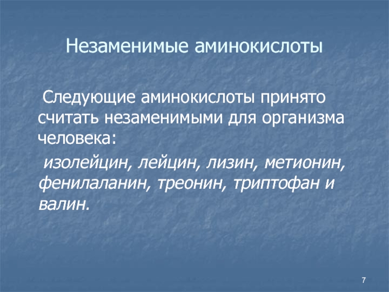 Слайд 7Незаменимые аминокислоты