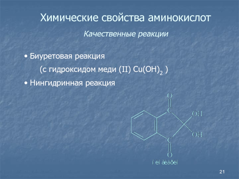 Слайд 21Химические свойства аминокислот Качественные реакции