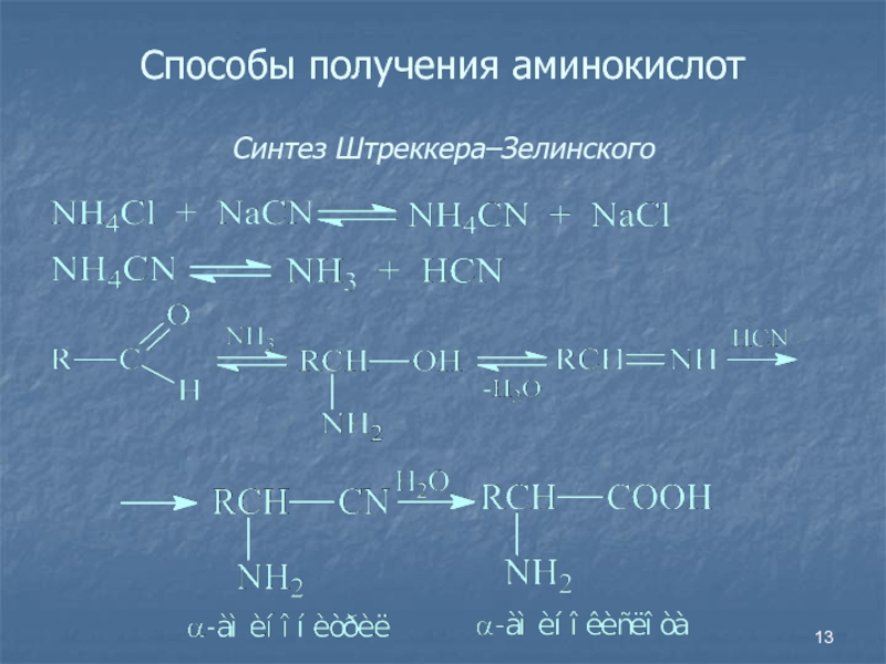 Слайд 13Способы получения аминокислот Синтез Штреккера–Зелинского
