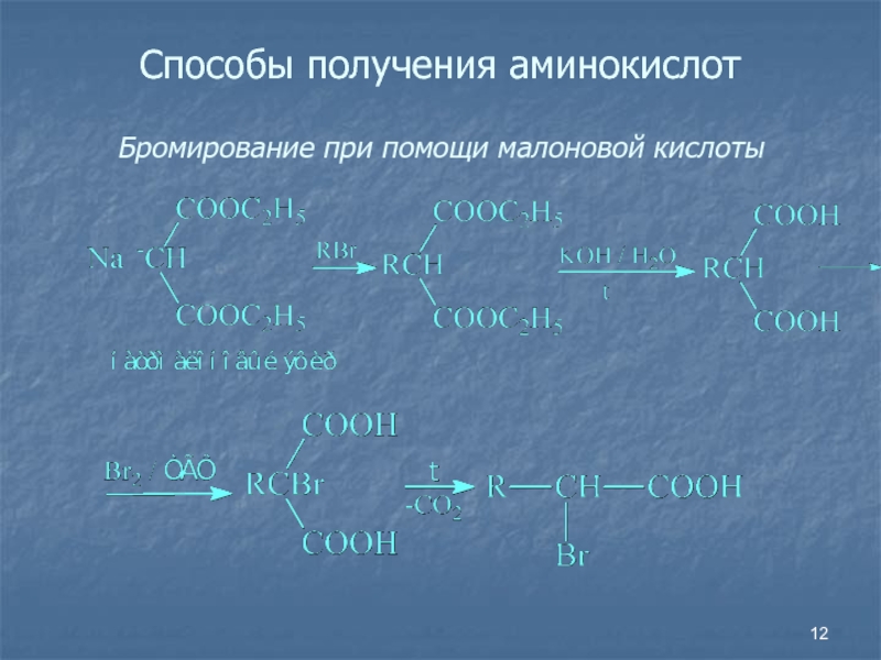 Слайд 12Способы получения аминокислот Бромирование при помощи малоновой кислоты