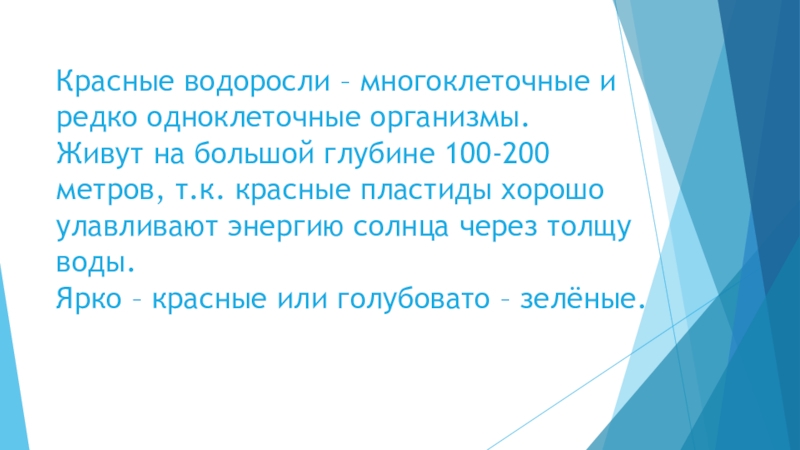 Слайд 13Красные водоросли – многоклеточные и редко одноклеточные организмы. Живут на большой глубине