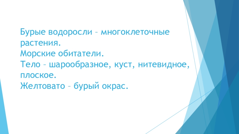 Слайд 9Бурые водоросли – многоклеточные растения. Морские обитатели. Тело – шарообразное, куст, нитевидное, плоское. Желтовато