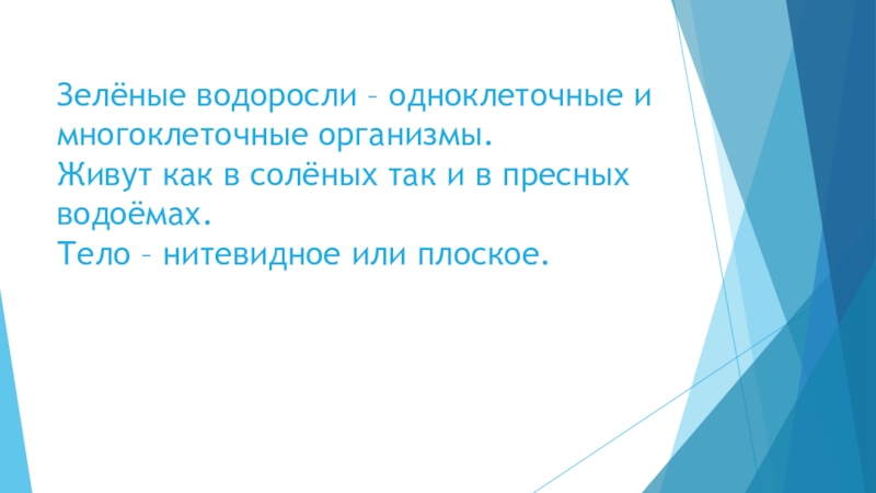 Зелёные водоросли – одноклеточные и многоклеточные организмы.  Живут как в солёных так и в пресных водоёмах.