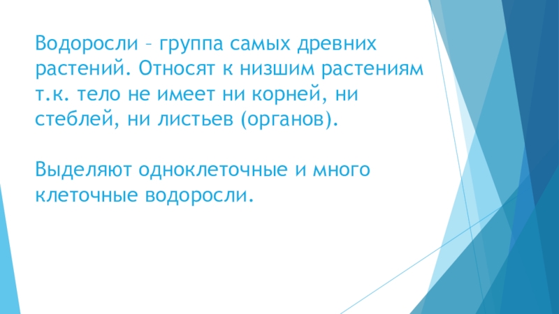 Водоросли – группа самых древних растений. Относят к низшим растениям т.к. тело не имеет ни корней, ни стеблей, ни листьев (органов). Выделяют одноклеточные и много клеточные водоросли.