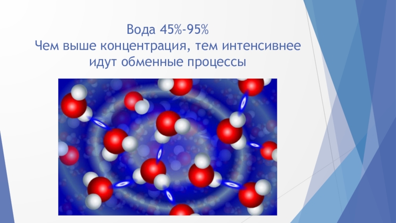 Слайд 30Вода 45%-95% Чем выше концентрация, тем интенсивнее идут обменные процессы