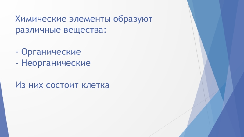 Химические элементы образуют различные вещества:  - Органические - Неорганические  Из них состоит клетка