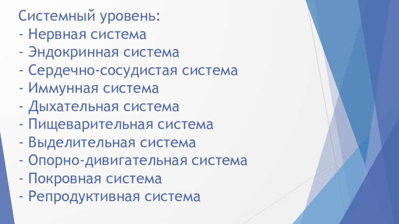 Системный уровень: - Нервная система - Эндокринная система  - Сердечно-сосудистая система - Иммунная система - Дыхательная