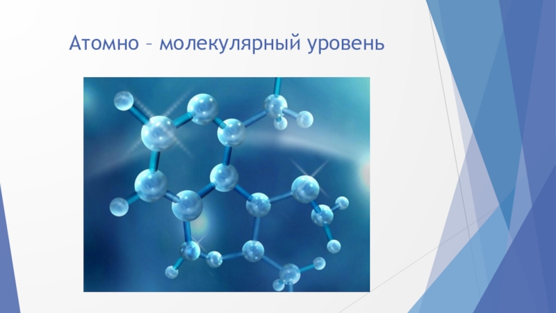 Слайд 10Атомно – молекулярный уровень Все сущее состоит из атомов, атомы образуют молекулы,