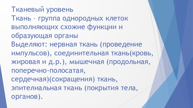 Слайд 44Тканевый уровень Ткань – группа однородных клеток выполняющих схожие функции и образующая