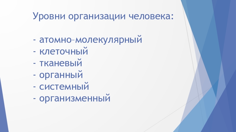 Уровни организации человека:  - атомно–молекулярный - клеточный - тканевый - органный - системный - организменный