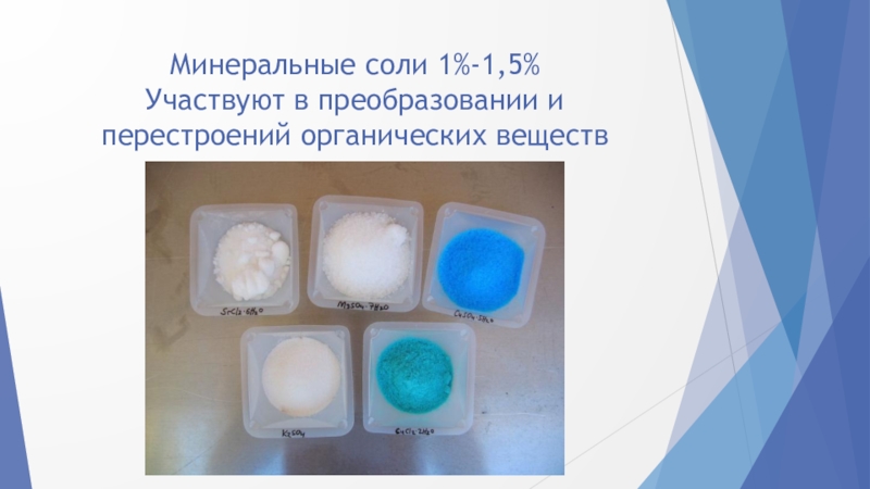 Слайд 31Минеральные соли 1%-1,5% Участвуют в преобразовании и перестроений органических веществ
