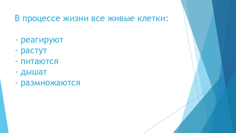 Слайд 2В процессе жизни все живые клетки: - реагируют - растут - питаются - дышат - размножаются
