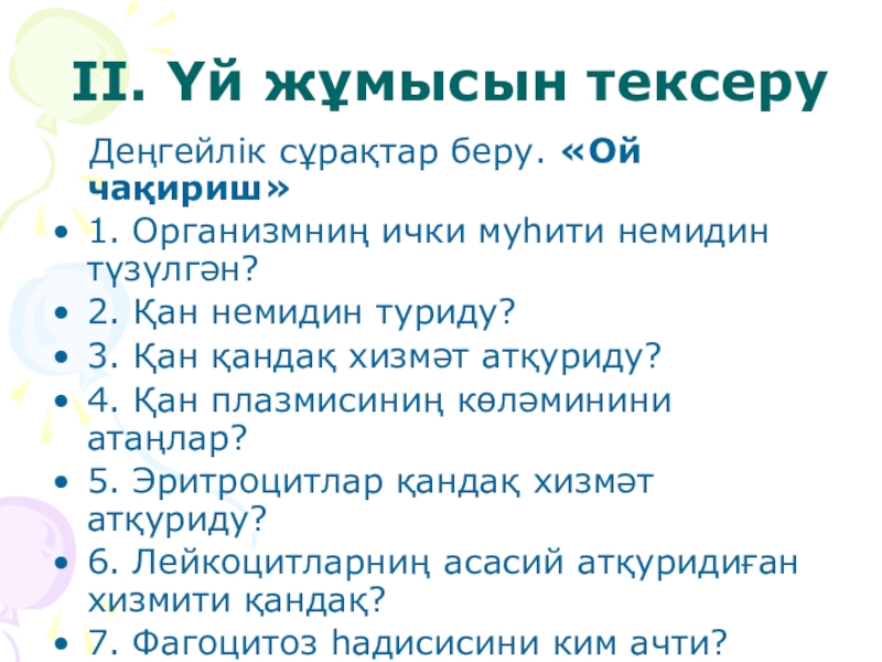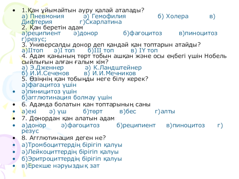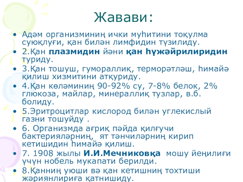 2. Группы дегән сөзниң уйғурчә тәржимиси? 3. Жараһәтләнгәндә, зәхмиләнгәндә қан көп кәтсә у адәмгә немә қандақ ярдәм берилиду? 4Адәмниң қенида болидиған алаһидә белок маддиси?