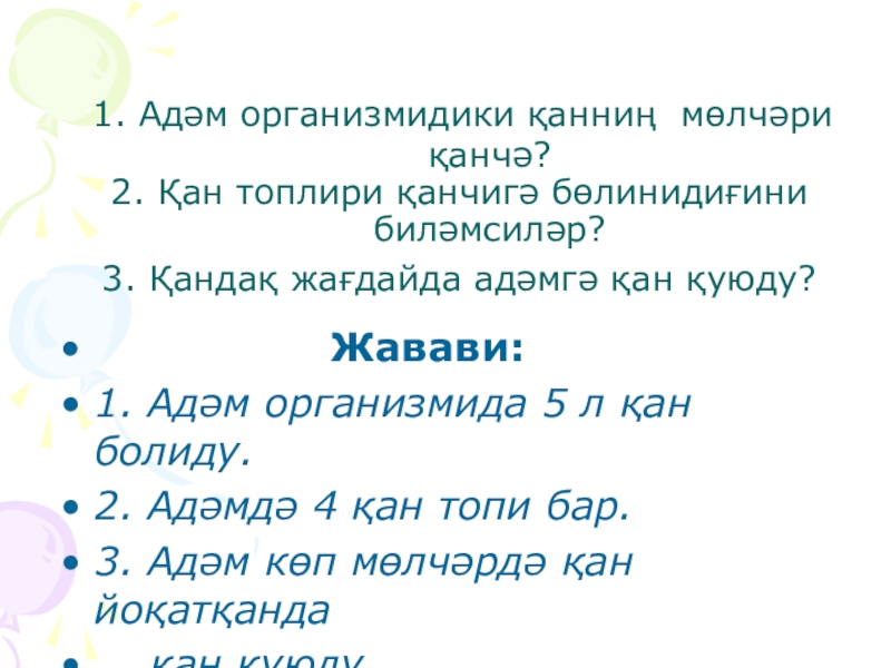 1. Адәм организмида 5 л қан болиду.