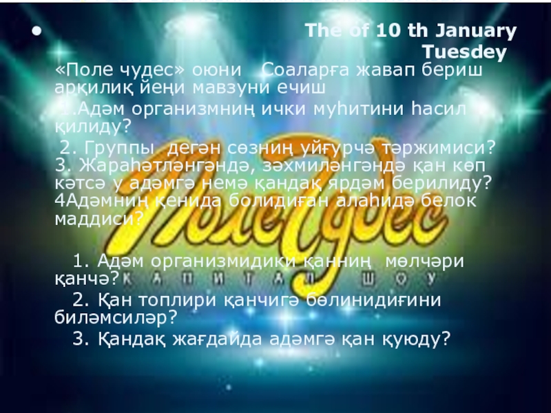 Tuesdey «Поле чудес» оюни Соаларға жавап бериш арқилиқ йеңи мавзуни ечиш