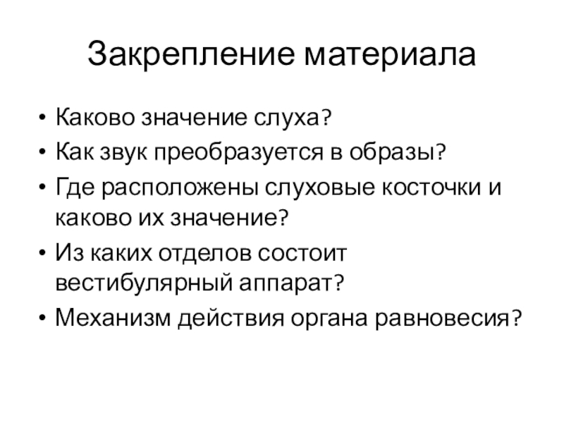 Закрепление материалаКаково значение слуха?Как звук преобразуется в образы?Где расположены слуховые косточки и каково их значение?Из каких отделов