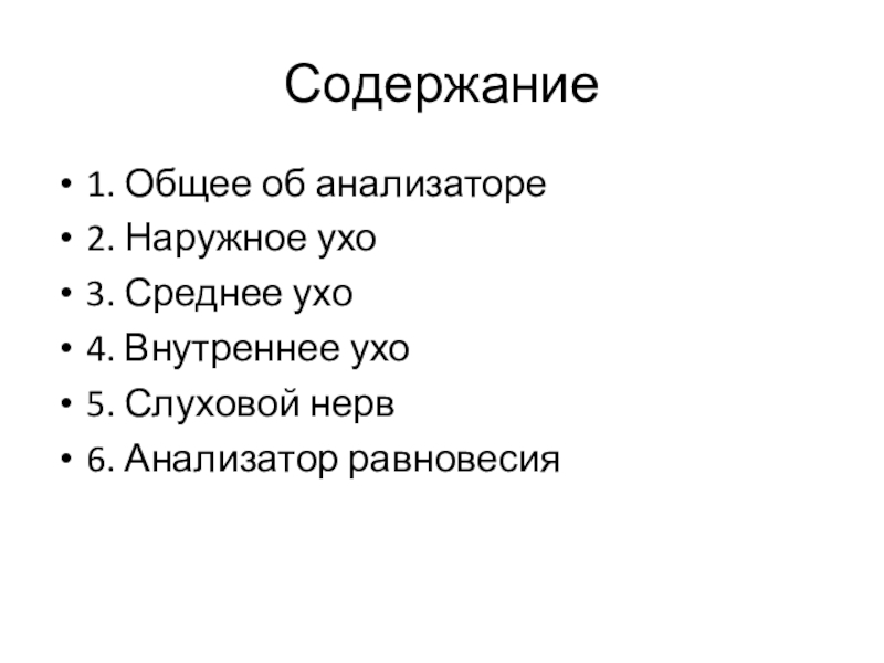 Содержание1. Общее об анализаторе2. Наружное ухо3. Среднее ухо4. Внутреннее ухо5. Слуховой нерв6. Анализатор равновесия