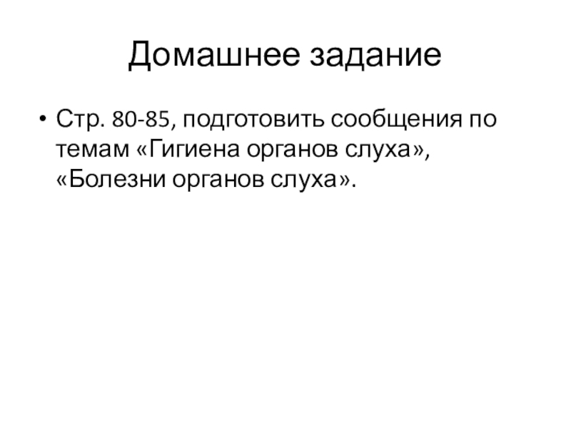 Домашнее заданиеСтр. 80-85, подготовить сообщения по темам «Гигиена органов слуха», «Болезни органов слуха».