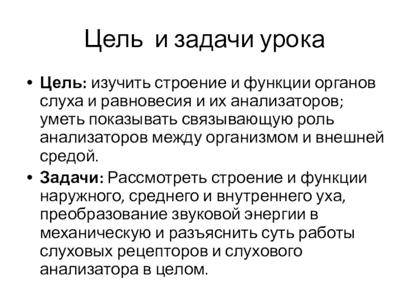 Цель и задачи урокаЦель: изучить строение и функции органов слуха и равновесия и их анализаторов; уметь показывать связывающую