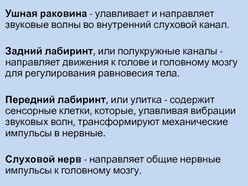 Слайд 4Ушная раковина - улавливает и направляет звуковые волны во внутренний слуховой