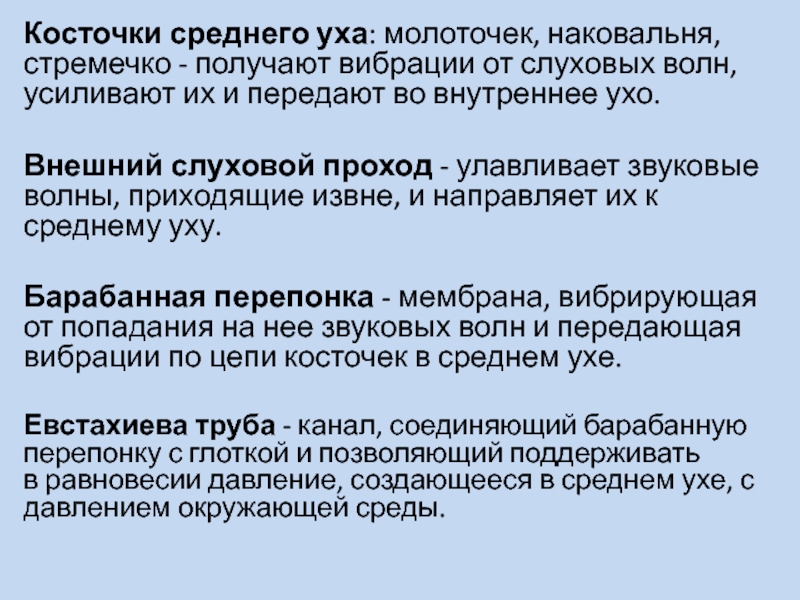 Слайд 5Косточки среднего уха: молоточек, наковальня, стремечко - получают вибрации от слуховых
