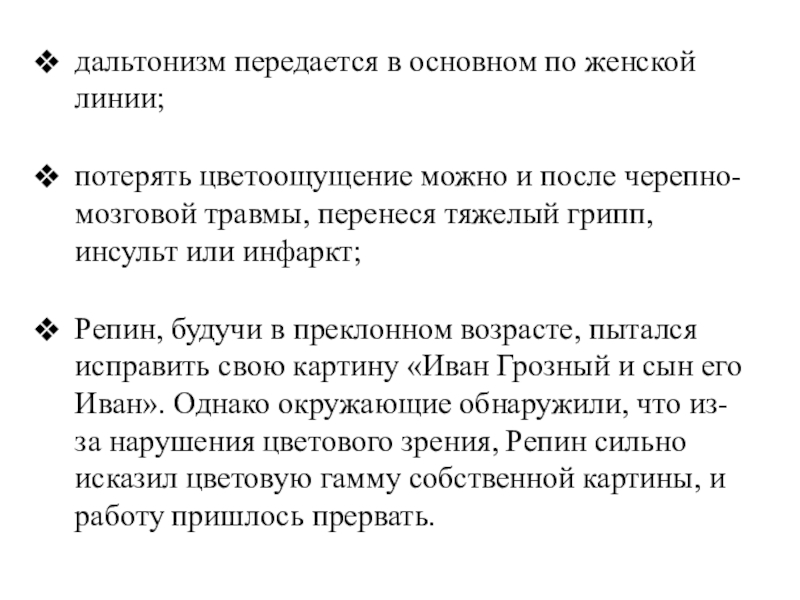 Репин, будучи в преклонном возрасте, пытался исправить свою картину «Иван Грозный и сын его Иван». Однако окружающие обнаружили, что из-за нарушения цветового зрения, Репин сильно исказил цветовую гамму собственной картины, и работу пришлось прервать.