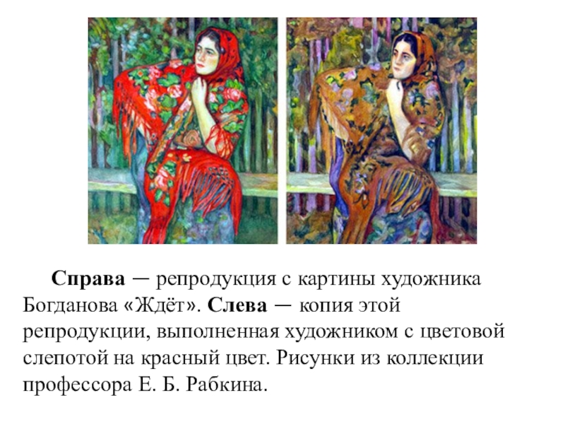 Слайд 9Справа — репродукция с картины художника Богданова «Ждёт». Слева — копия