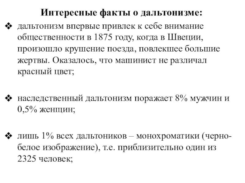 1875 году, когда в Швеции, произошло крушение поезда, повлекшее большие жертвы. Оказалось, что машинист не различал красный цвет;