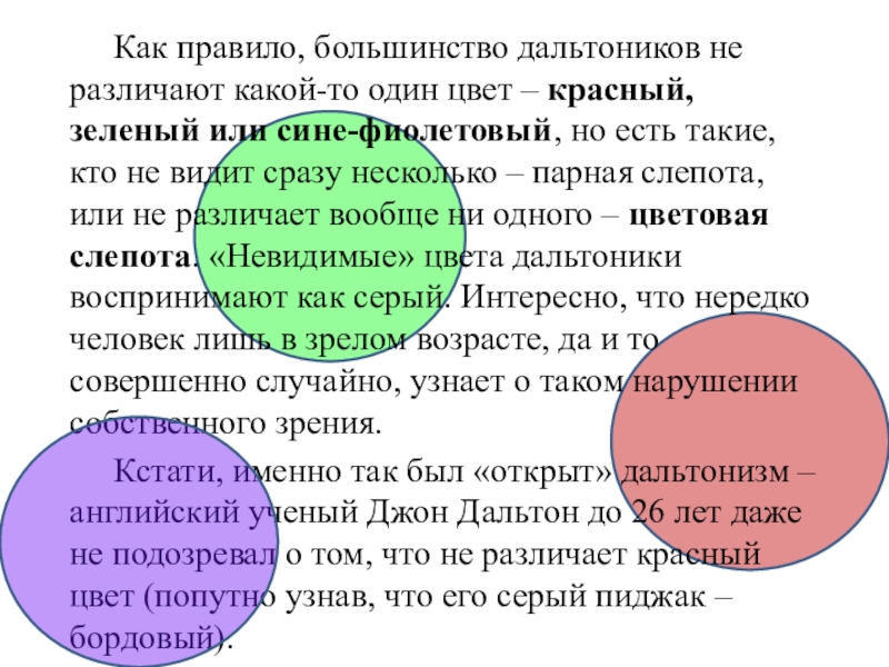 Слайд 4Как правило, большинство дальтоников не различают какой-то один цвет – красный,