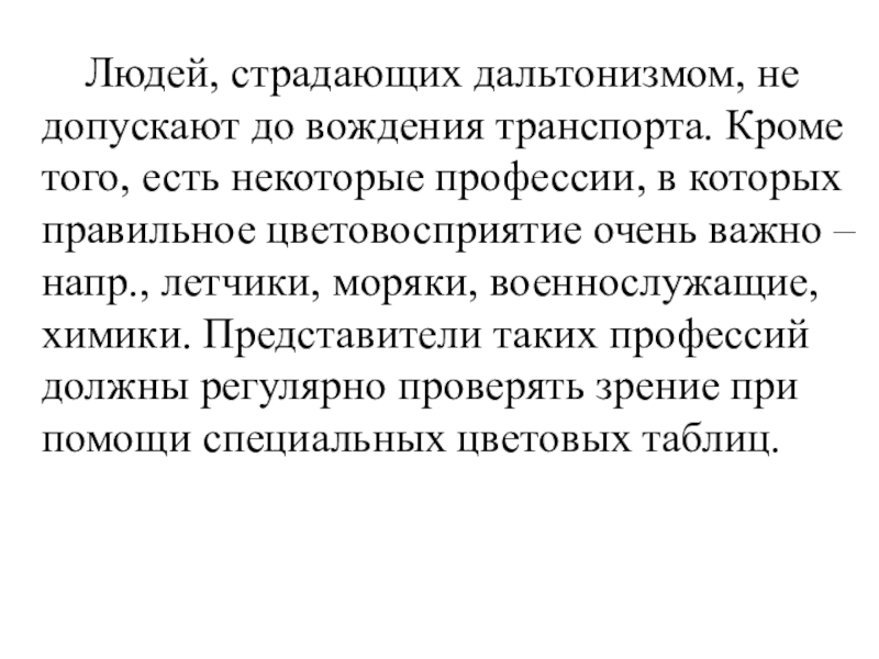Слайд 5Людей, страдающих дальтонизмом, не допускают до вождения транспорта. Кроме того, есть