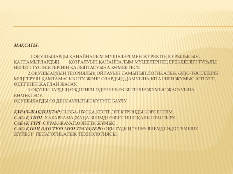 Слайд 2Мақсаты: 1.Оқушыларды қанайналым мүшелері мен