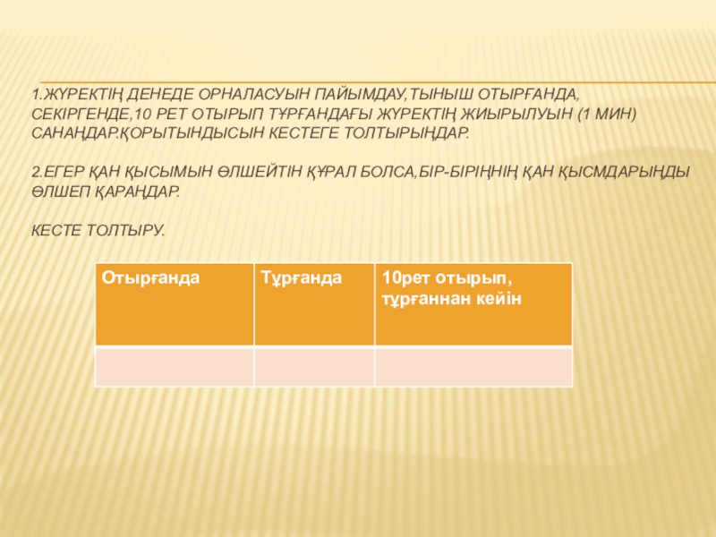 Слайд 101.Жүректің денеде орналасуын пайымдау,тыныш отырғанда,секіргенде,10 рет отырып тұрғандағы жүректің жиырылуын (1
