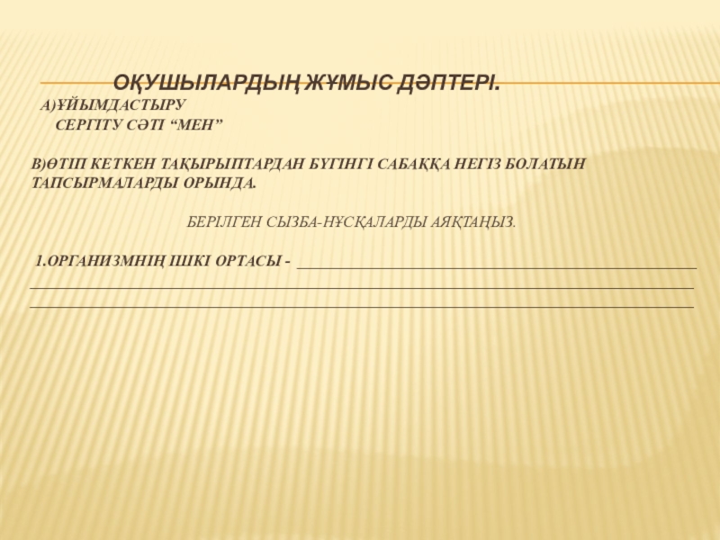 дәптері. А)Ұйымдастыру Сергіту сәті “Мен” в)Өтіп кеткен тақырыптардан бүгінгі сабаққа негіз болатын тапсырмаларды орында. Берілген сызба-нұсқаларды аяқтаңыз. 1.Организмнің ішкі ортасы - __________________________________________________ ___________________________________________________________________________________ ___________________________________________________________________________________
