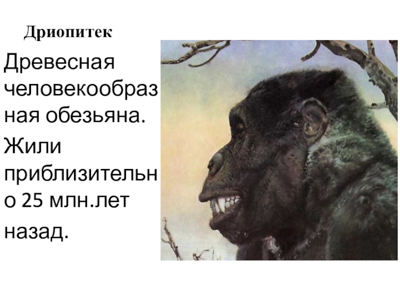 ДриопитекДревесная человекообразная обезьяна.Жили приблизительно 25 млн.лет назад.