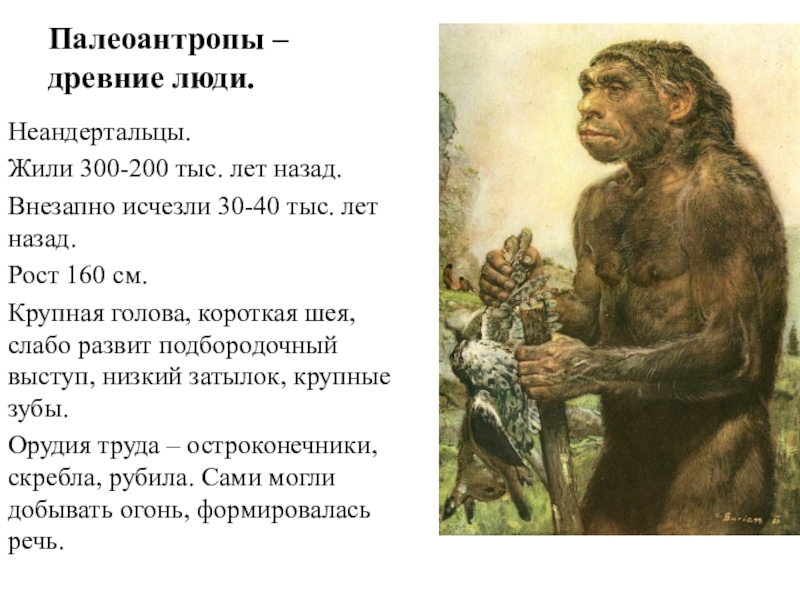 Палеоантропы – древние люди.Неандертальцы.Жили 300-200 тыс. лет назад.Внезапно исчезли 30-40 тыс. лет назад.Рост 160 см.Крупная голова, короткая