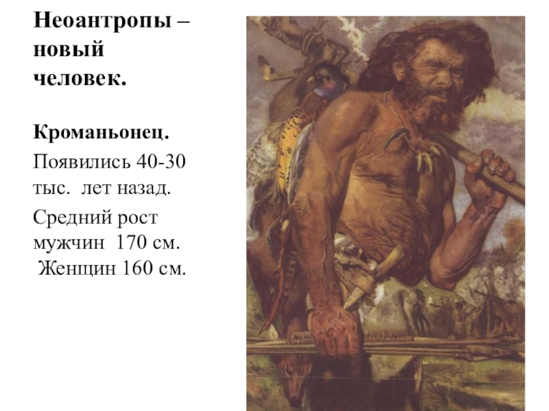 Неоантропы – новый человек.Кроманьонец.Появились 40-30 тыс. лет назад.Средний рост мужчин 170 см.  Женщин 160 см.