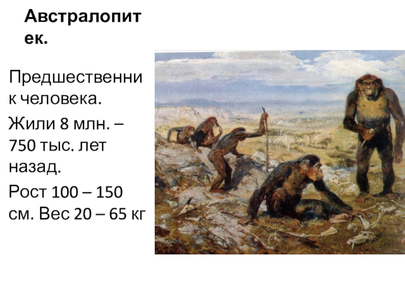 Австралопитек.Предшественник человека.Жили 8 млн. – 750 тыс. лет назад.Рост 100 – 150 см. Вес 20 – 65