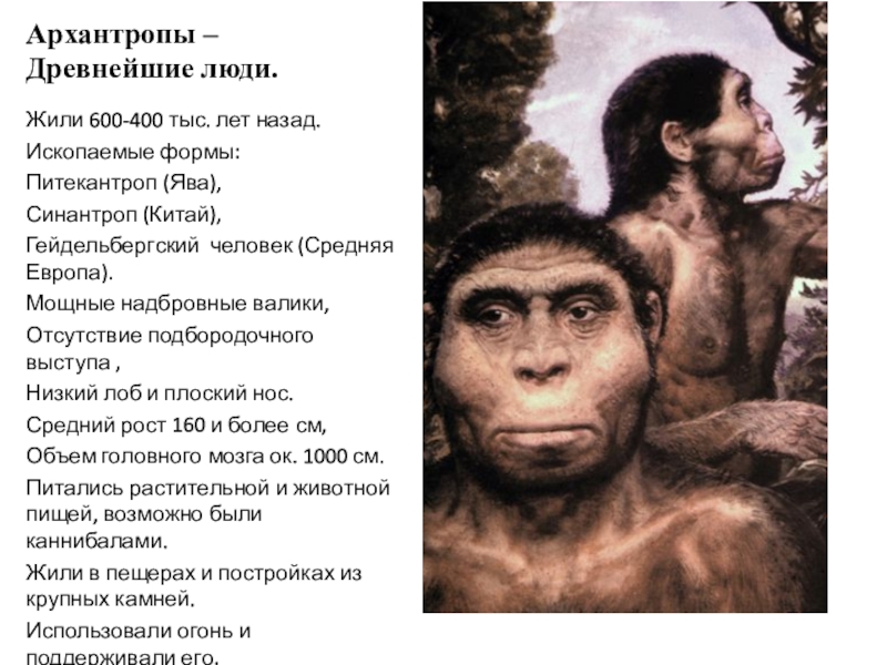 Архантропы – Древнейшие люди.Жили 600-400 тыс. лет назад.Ископаемые формы:Питекантроп (Ява),Синантроп (Китай),Гейдельбергский человек (Средняя Европа).Мощные надбровные валики,Отсутствие подбородочного