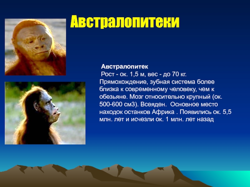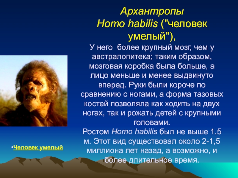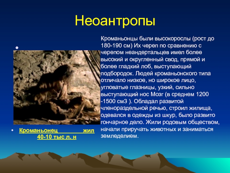 Кроманьонцы были высокорослы (рост до 180-190 см) Их череп по сравнению с черепом неандертальцев имел более высокий и округленный свод, прямой и более гладкий лоб, выступающий подбородок. Людей кроманьонского типа отличало низкое, но широкое лицо, угловатые глазницы, узкий, сильно выступающий нос Мозг (в среднем 1200 -1500 см3 ). Обладал развитой членораздельной речью, строил жилища, одевался в одежды из шкур, было развито гончарное дело. Жили родовым обществом, начали приручать животных и заниматься земледелием.