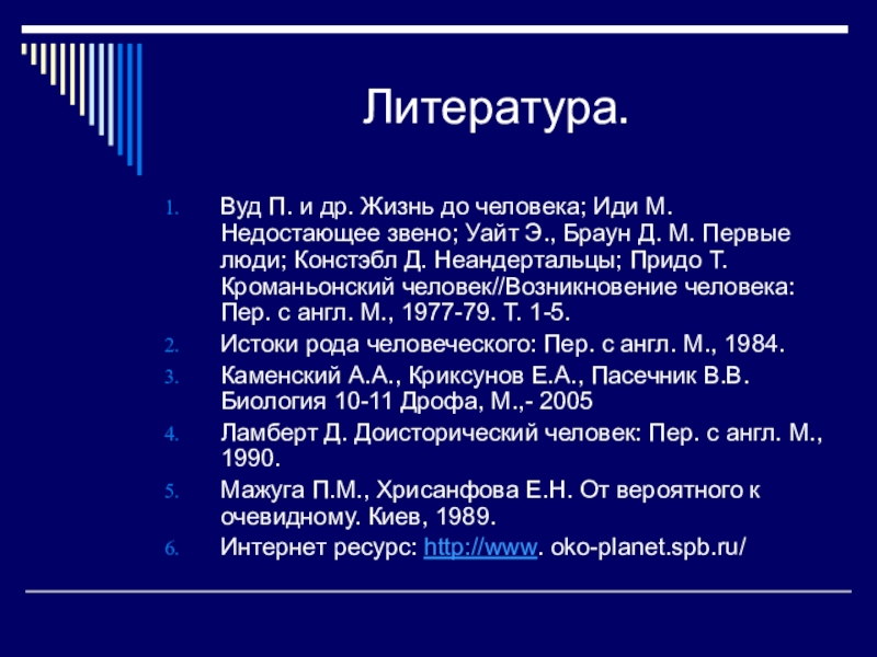 Уайт Э., Браун Д. М. Первые люди; Констэбл Д. Неандертальцы; Придо Т. Кроманьонский человек//Возникновение человека: Пер. с англ. М., 1977-79. Т. 1-5.