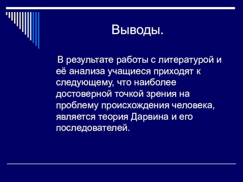 приходят к следующему, что наиболее достоверной точкой зрения на проблему происхождения человека, является теория Дарвина и его последователей.