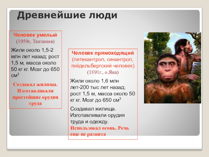 Жили около 1,6 млн лет-200 тыс лет назад; рост 1,5 м, масса около 50 кг кг. Мозг до 650 см3
