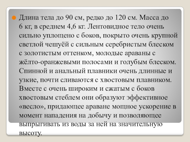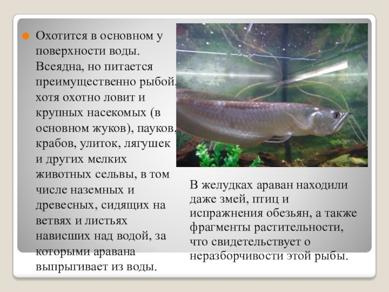 Охотится в основном у поверхности воды. Всеядна, но питается преимущественно рыбой, хотя охотно ловит и крупных насекомых (в основном жуков), пауков, крабов, улиток, лягушек и других мелких животных сельвы, в том числе наземных и древесных, сидящих на ветвях и листьях нависших над водой, за которыми аравана выпрыгивает из воды.
