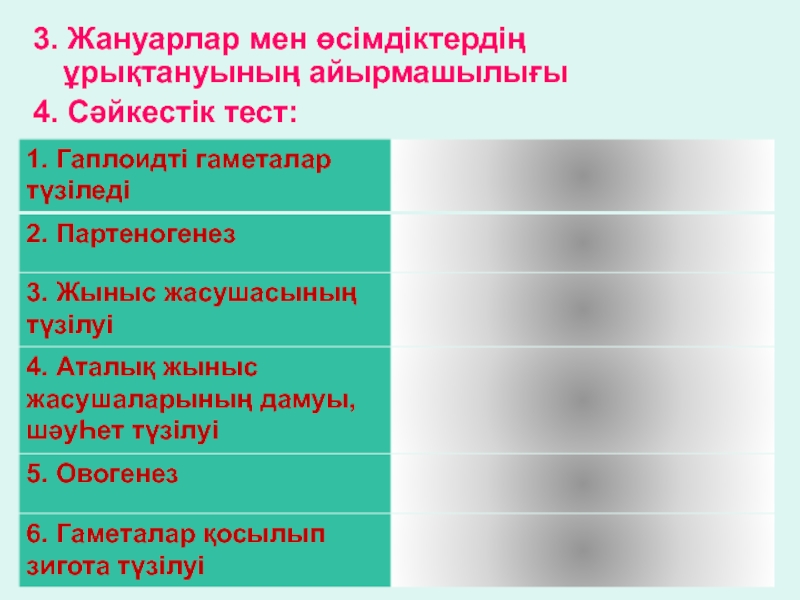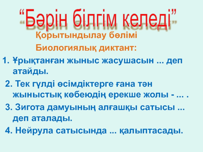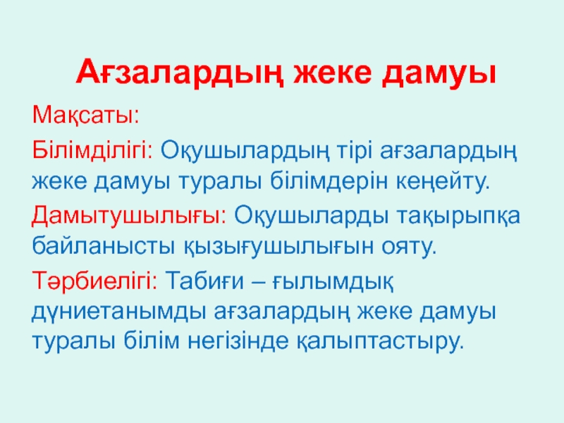 Тәрбиелігі: Табиғи – ғылымдық дүниетанымды ағзалардың жеке дамуы туралы білім негізінде қалыптастыру.