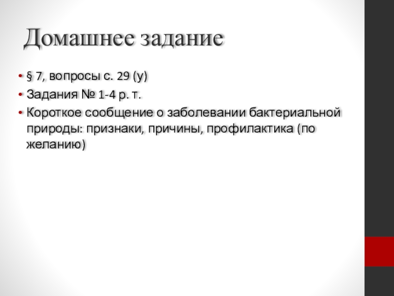 Домашнее задание§ 7, вопросы с. 29 (у)Задания № 1-4 р. т. Короткое сообщение о заболевании бактериальной природы: признаки, причины, профилактика (по желанию)