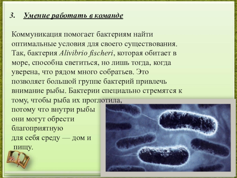 существования. Так, бактерия Аlivibrio fischeri, которая обитает в море, способна светиться, но лишь тогда, когда уверена, что рядом много собратьев. Это позволяет большой группе бактерий привлечь внимание рыбы. Бактерии специально стремятся к тому, чтобы рыба их проглотила,