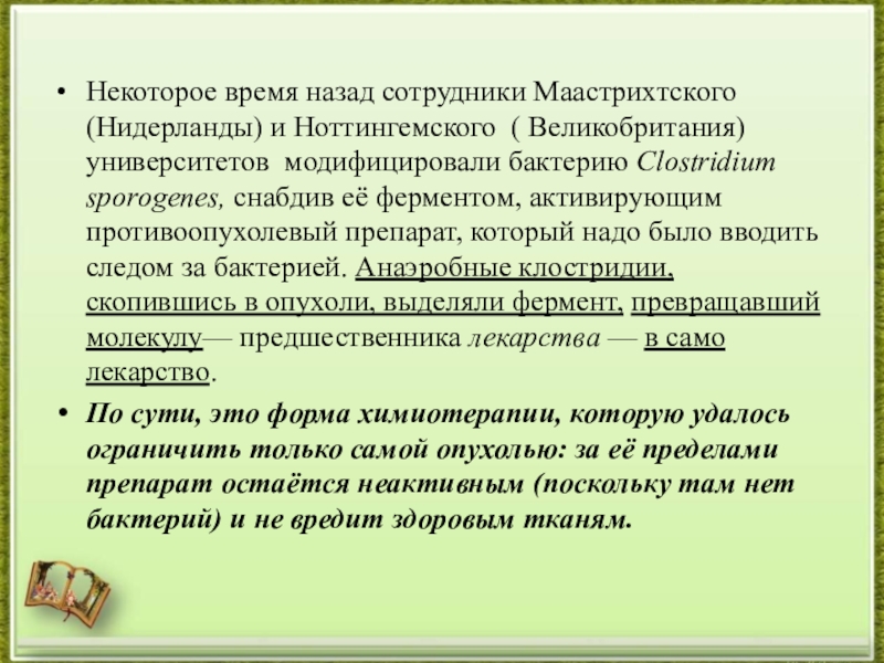 модифицировали бактерию Сlostridium sporogenes, снабдив её ферментом, активирующим противоопухолевый препарат, который надо было вводить следом за бактерией. Анаэробные клостридии, скопившись в опухоли, выделяли фермент, превращавший молекулу— предшественника лекарства — в само лекарство.