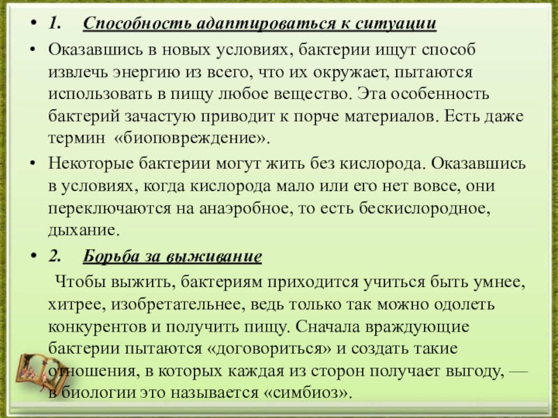 Чтобы выжить, бактериям приходится учиться быть умнее, хитрее, изобретательнее, ведь только так можно одолеть конкурентов и получить пищу. Сначала враждующие бактерии пытаются «договориться» и создать такие отношения, в которых каждая из сторон получает выгоду, — в биологии это называется «симбиоз».